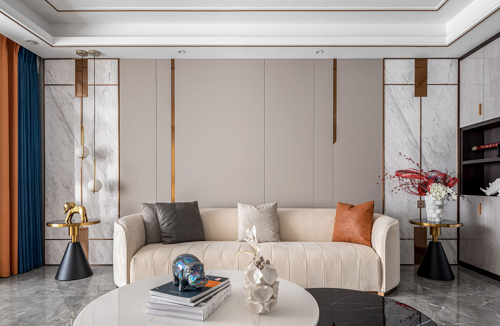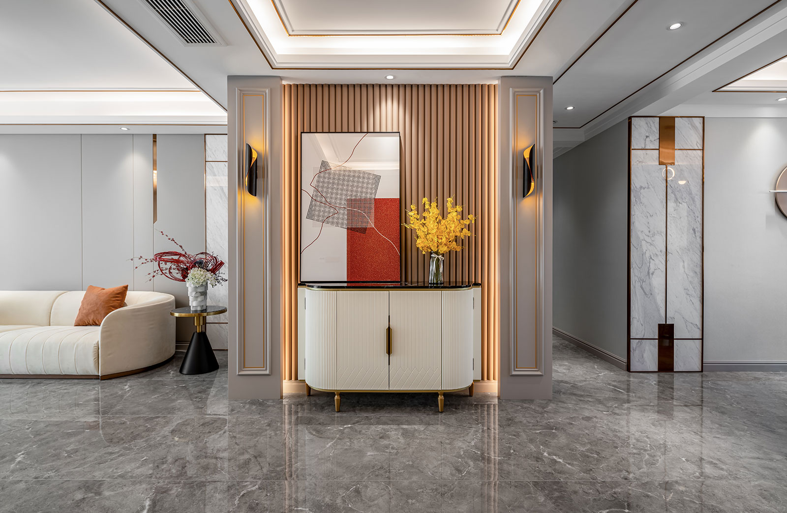 東南智匯城191㎡美式輕奢實(shí)景 淡淡暖灰色讓靜謐成為空間主導(dǎo) 美式的優(yōu)雅,輕奢的精致 金舍裝飾只為別墅而生