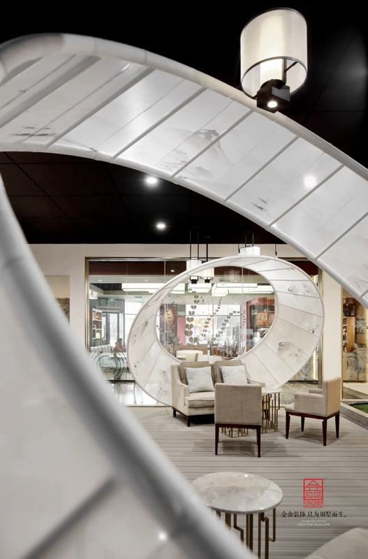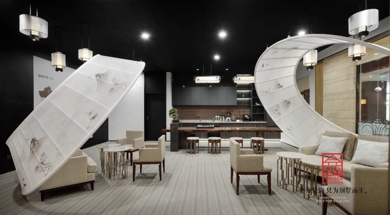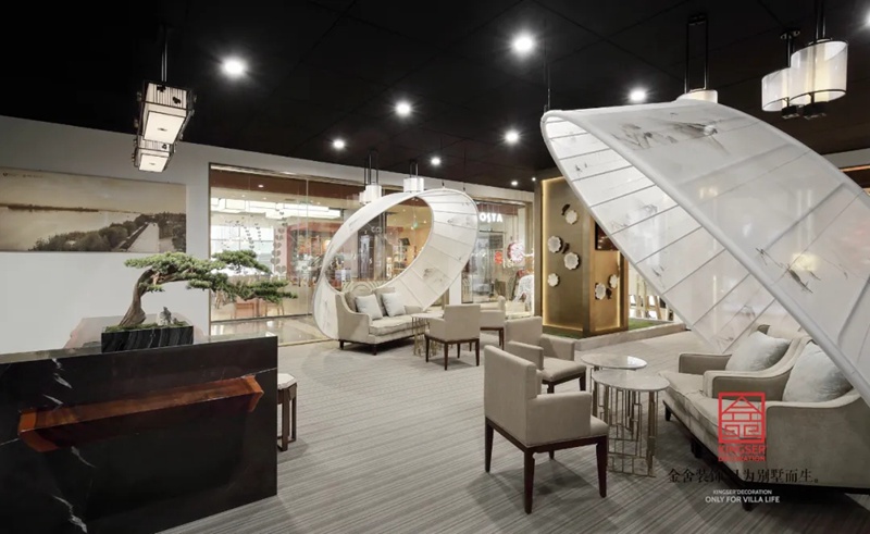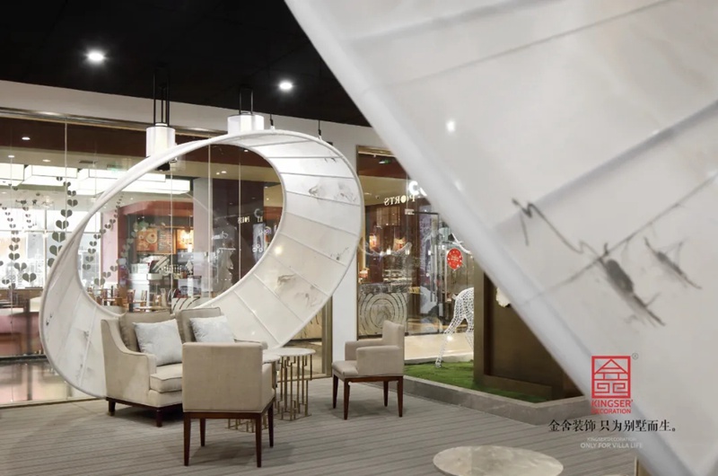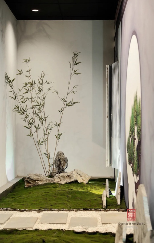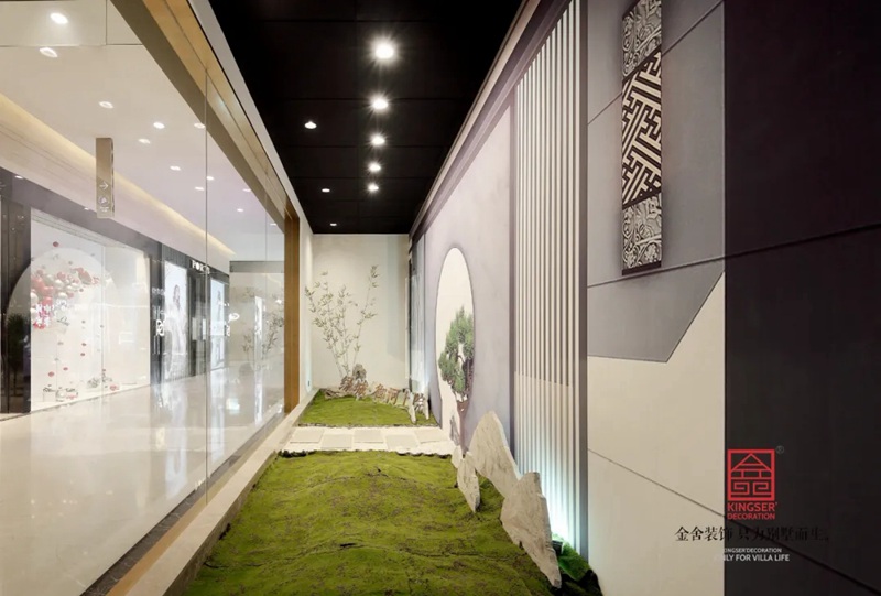 -御河上院在商場的樓盤展示區(qū)裝修實景,在設計中將自然與人文的意象融入室內(nèi)設計,綠意盎然的自然景象以其深厚的文化底蘊滋潤著人們的心靈,對自然的認識和感悟,讓人豁然開朗,心曠神怡,也就成為中國傳統(tǒng)文化資產(chǎn)的傳承、轉(zhuǎn)譯與新生 。