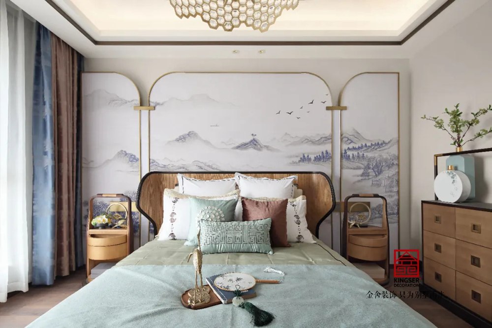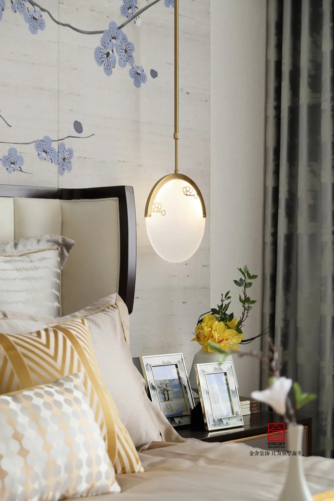 溫馨雅致的風格,主臥以水墨油畫床背幅搭配淡綠色床品,于沉穩中煥發和諧自然的氣氛;次臥以淡墨清研的枝頭壁布飾墻,配襯極具韻味的銀灰色亮光漆中式床頭柜,平添幾分時尚玩味,感覺愜意悠然。