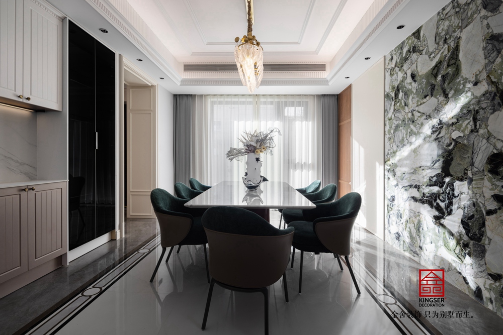 餐廳空間采用了透光奢石,這種材質以其高貴的氣質和獨特的紋理,為餐廚空間增添了一份奢華感。