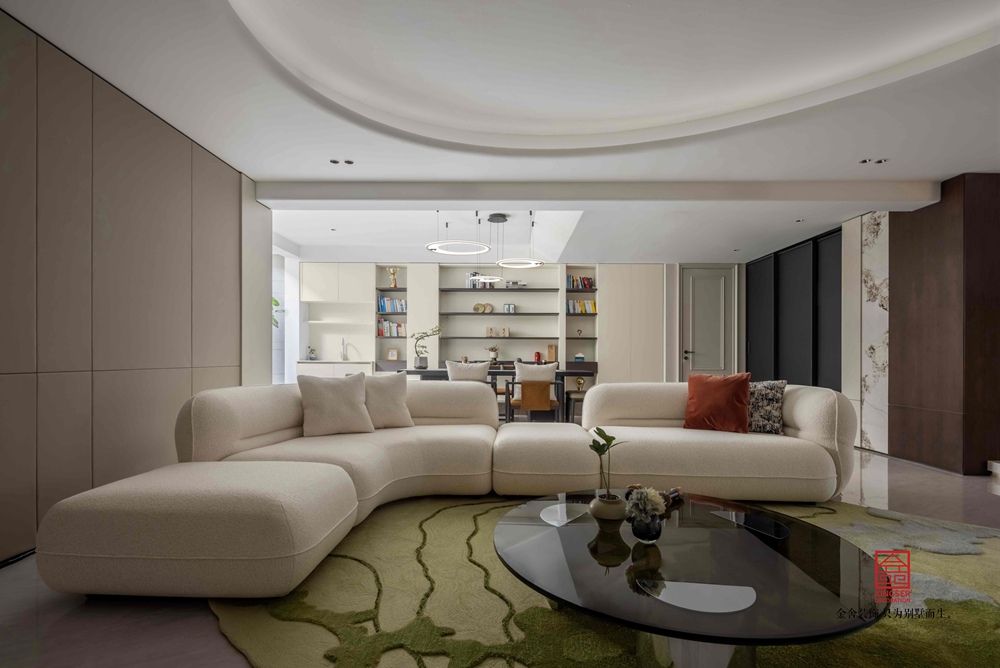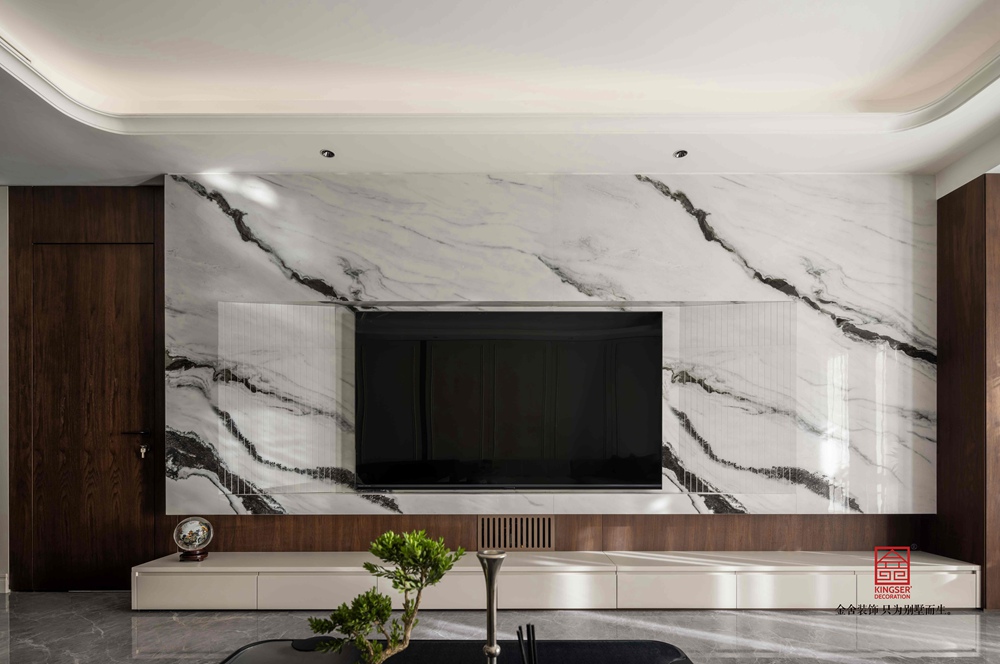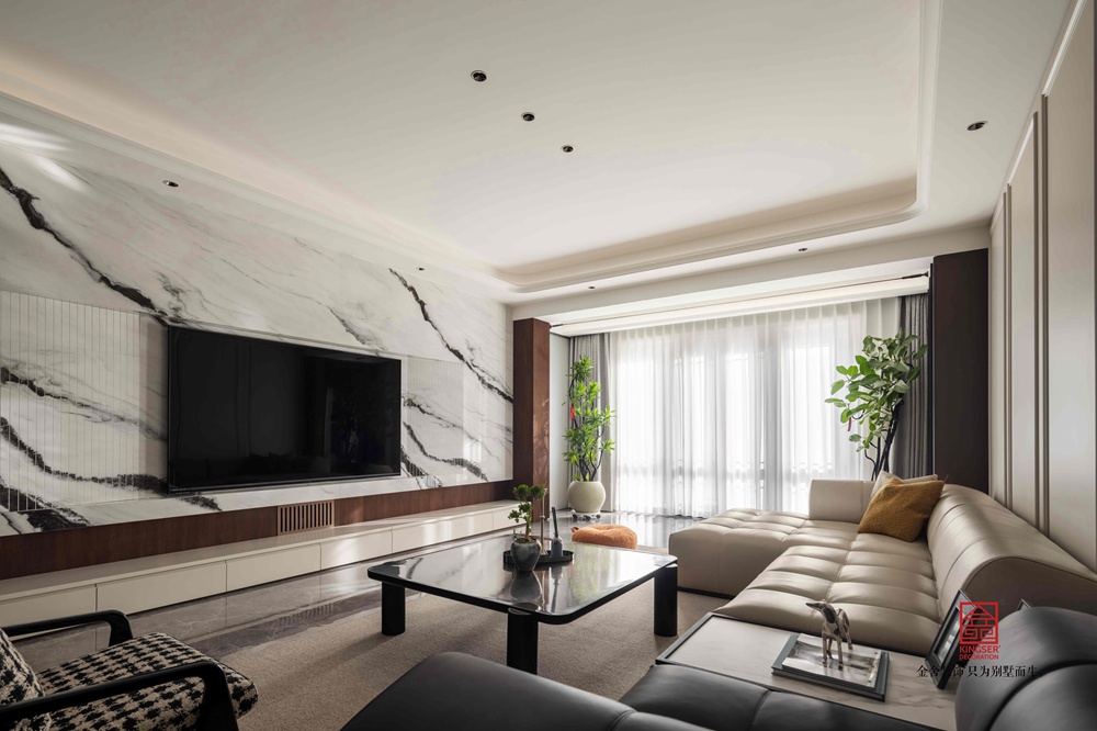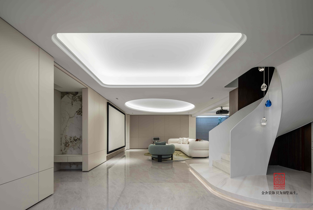 褪去城市繁冗華麗的外殼,回歸至與人的內在共鳴,斑駁的光影在客廳空間徜徉,大理石與墻板的搭配,釋放出一種優雅、沉靜及治愈的氛圍感,貫穿于整個別墅裝修空間的動線。