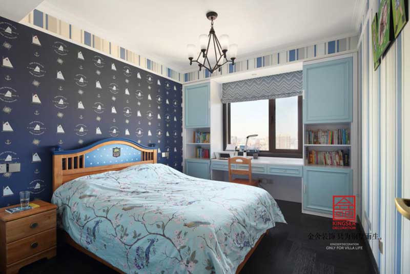 緞錦的寶石藍和絲綢的淺湖藍與背景墻象征這海天相接,相輔相成,每一個顏色都形成一種深遠的意境,或蕭瑟,或廣闊,或沉穩,或舒揚,不同的情景不同的韻味成就不同的家居舒適空間。
