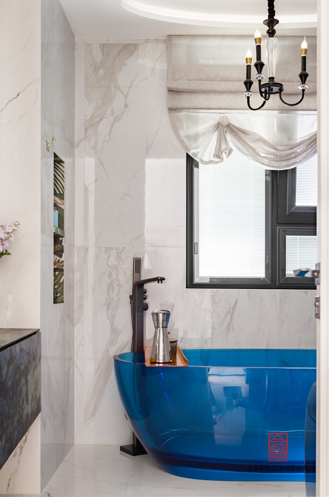 藍色多瑙河是這個空間的主調,不同純度,明度,亮度的藍色,讓空間高級浪漫,主衛打分最高,純純的法式浪漫情懷,淺海藍的透明浴缸,加之金屬銅色,奢華感十足。
