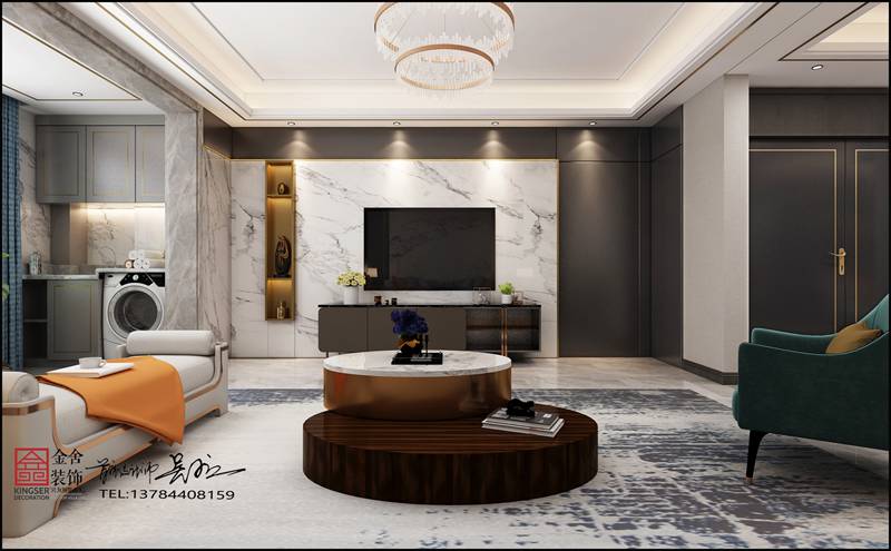 客廳的空間開敞、內外通透,在空間平面設計中追求不受傳統對稱限制。自由開放,力求創造出時代精神,獨具新意的裝飾,設計簡單、通俗、清新,更接近人們生活。