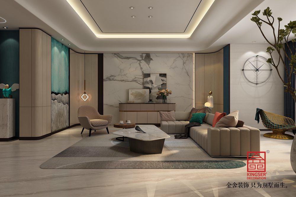 石家莊金舍裝飾-榮盛華府205平米現代風格裝修效果圖。此方案的風格傾向定位于現代風格。業主崇尚清新時尚的現代風格。通過與業主的深入溝通,本著輕裝修,重裝飾的原則,同時圍繞著業主對房子功能的要求,合理的對空間進行了改造與工能劃分。本案的設計重點是會客空間與門廳、餐廳以及過道空間互通與交流,從設計手法上采用了從墻面上的線與面銜接呼應,以及頂面的空間的虛擬劃分。墻漆、壁紙與家具配飾的使用,使空間更加豐富與溫馨。達到各功能空間融匯貫通的目的。成熟細致的線條結合家具與軟裝,烘托內斂優雅的大宅風范。開放式廚房,增加了家庭的互動性。