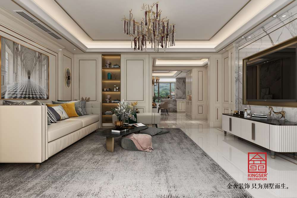 設計說明:此案例為石家莊金舍裝飾-榮盛華府205平米美式風格裝修效果圖。美式風格的客廳面積很大,看上去就很氣派,加上非常有質感的家具,盡顯奢華意境,美式風格的裝修很注重各種線條的裝飾,吊頂和墻面上都有美觀的線條,水晶吊燈更是增加了整個客廳的亮度,同時也提升了檔次,墻面上的掛畫非常有藝術氣息,體現了主人的文化底蘊,在這樣的客廳里家人一起休閑娛樂或是招待客人都是非常好的。