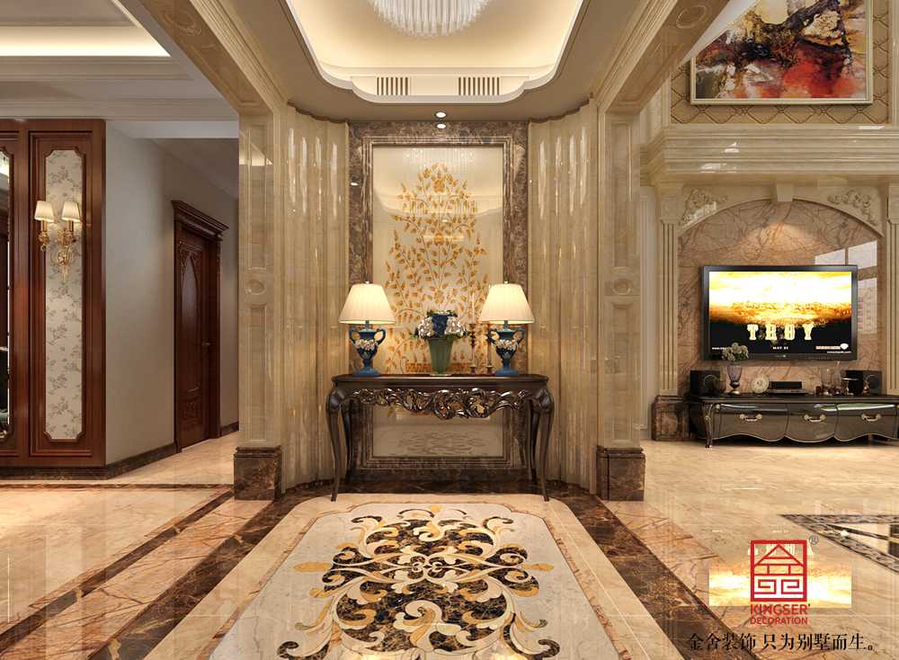 設計說明:此案例為石家莊裝修公司-香邑瀾山270平米歐式風格裝修效果圖。歐式風格強調以華麗的裝飾、濃烈的色彩、精美的造型達到華貴的裝飾效果。歐式客廳頂部用大型燈池,并用華麗的枝形吊燈營造氣氛。門窗上半部做成弧形,并用帶有花紋的石膏線勾邊,室內則有壁燈造型。墻面用優質乳膠漆,以襯托豪華效果。