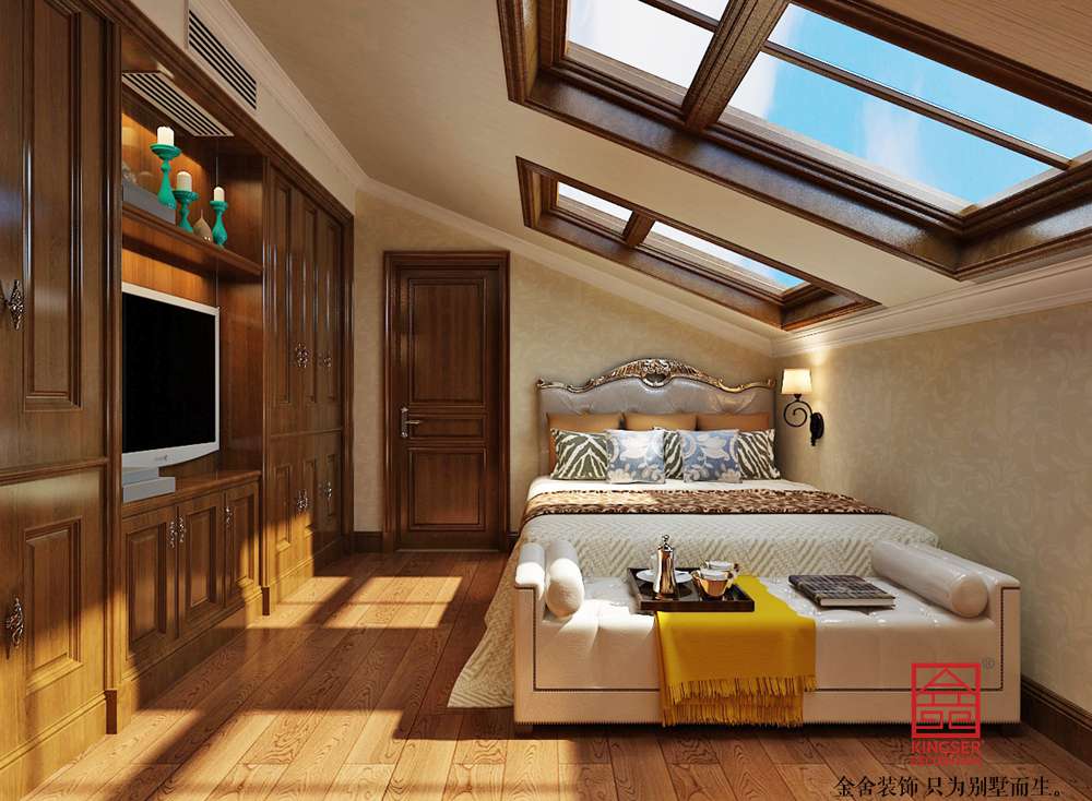 客廳的大部分在挑空結構之下,大面積的玻璃窗帶來了良好的采光,落地的窗簾很是氣派。布藝沙發組合有著絲絨的質感以及流暢的木質曲線,將傳統歐式家居的奢華與現代家居的實用性完美地結合。壁燈自然不可或缺,它被安置在空間的交匯處,又與四幅色彩鮮艷的油畫相呼應,給敞開式的客廳提供了一個新的亮