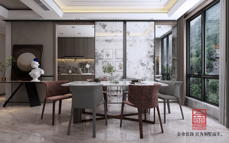 客餐廳南北通透、陽光穿堂而過。進門玄關處石膏板凹凸造型搭配上藝術漆以金屬邊線做分界線裝飾分割更顯靈動。右邊緊接餐廳廚房,以玻璃門分割廚房和餐廳拉開門及是半開放式廚房。使餐廚空間更加靈動通透。