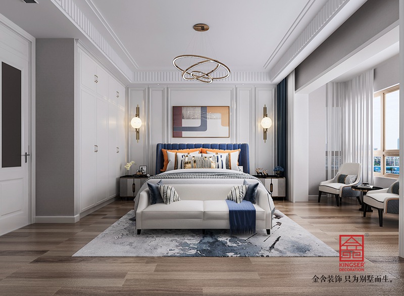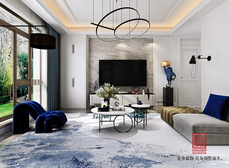 此案例為石家莊金舍裝飾-大者別墅200平米現(xiàn)代法式裝修效果圖。半個(gè)世紀(jì)前,在意大利米蘭的畫展上,克萊因的藍(lán)色首次亮相,八幅同樣大小、布滿天鵝絨質(zhì)感的藍(lán)色畫布讓人驚喜。我們從藝術(shù)展中獲取靈感,運(yùn)用到室內(nèi)設(shè)計(jì)中,試圖營造一種極具藝術(shù)感的現(xiàn)代空間。
