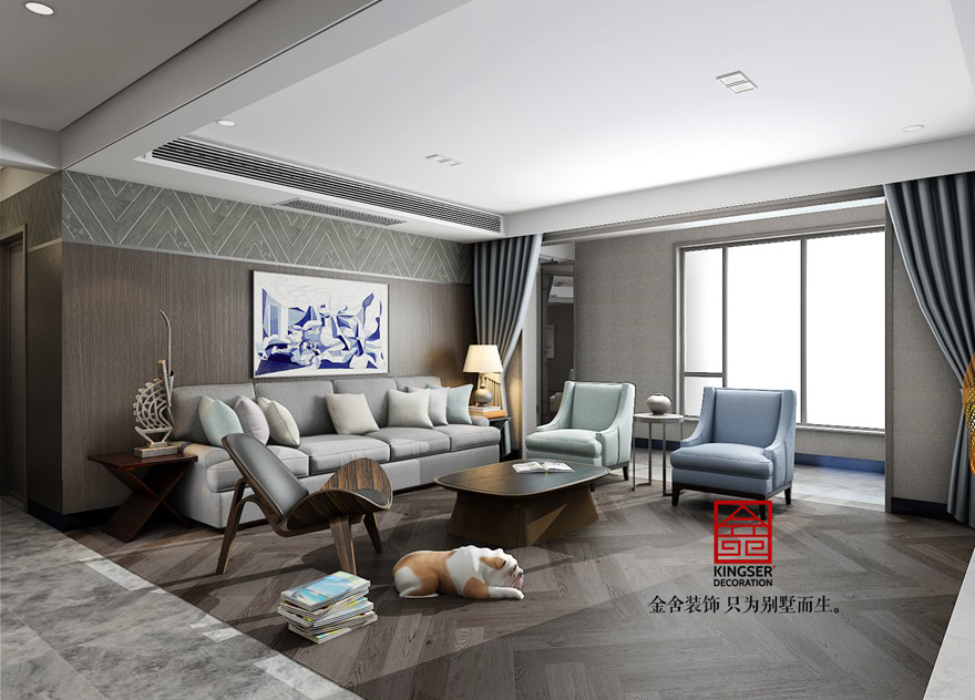 設計說明:此案例為石家莊金舍裝飾-保利拉菲公館197平現代輕奢裝修效果圖。入戶玄關,整體風格定調為現代意大利輕奢風格。硬裝顏色多與黑白灰為主,暖咖色為輔。由于原始結構房高僅有2720,所以頂面無任何多余裝飾線,主要用光影以及凝練的線條去劃分空間感,地面兩種材質去劃分空間,底色多以灰色系為主,軟裝家具用亮顏色去填充家中的冰感??蛷d硬裝顏色劃分為兩個部分,頂面與電視墻相接,淺色調裝飾,墻面雅士白天然大理石點綴輕奢,沙發墻與地面相接,暖咖色系,多以木制品出現,更為柔和。
