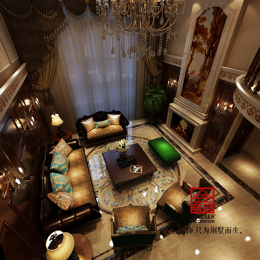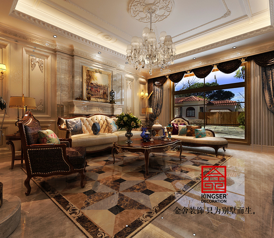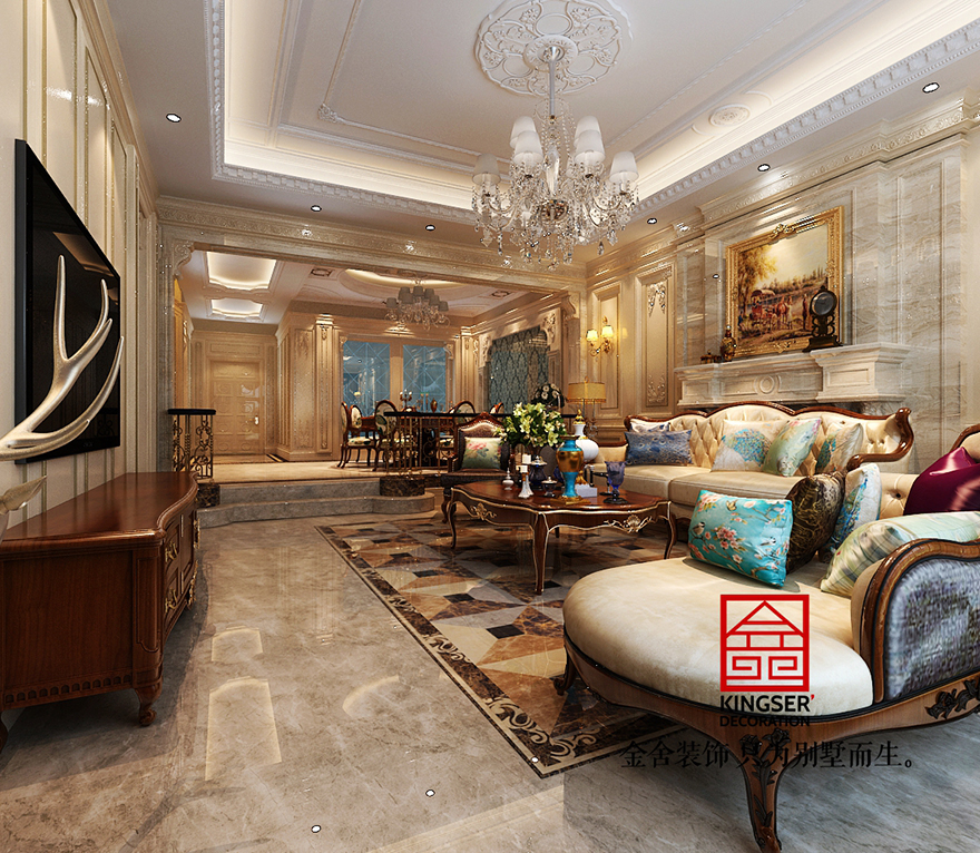 設計說明:此案例為石家莊金舍裝飾-原河名墅380平美式風格裝修效果圖。美式風格強調以華麗的裝飾、濃烈的色彩、精美的造型達到華貴的裝飾效果。美式客廳頂部用大型燈池,并用華麗的 枝形吊燈營造氣氛。門窗上半部做成弧形,并用帶有花紋的石膏線勾邊,室內則有壁燈造型。墻面用優質乳膠漆,以襯托 豪華效果。地面材料以石材和地板為主。美式客廳用家具和軟裝飾來營造整體效果,深色的像木和楓木家具,色彩鮮艷的 布藝沙發,都是本案美式客廳里的主角。還有浪漫的羅馬簾,精美的油畫,制作精良的雕塑工藝品,都是點染美式風格不 可缺少的元素。在美式家居空間里,在墻上掛金屬框抽象畫和攝影作品,選擇一些西方藝術名家的贗品,如人體畫,直接把西方藝術帶到家里,以營造濃郁的藝術氛圍,表現主人的文化素養。