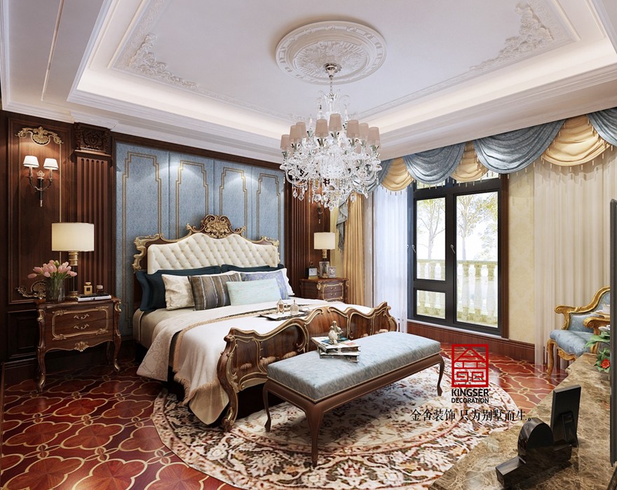 設計說明:此案例為石家莊金舍裝飾-榮盛華府220平法式風格裝修效果圖。法式風格建筑講究點綴在自然中,并不在乎占地面積大小,追求色彩和內在聯系,讓人感到有很大的活動空間。不過,有時也有意呈現建筑與周圍環境的沖突。因此,法式建筑往往不求簡單的協調,而是崇尚沖突之美。在設計上講求心靈的自然回歸感,給人一種撲面而來的濃郁氣息。開放式的空間結構、隨處可見的花卉和綠色植物、雕刻精細的家具……所有的一切從整體上營造出一種田園之氣。不論是床頭臺燈圖案中嬌艷的花朵,抑或是窗前的一把微微晃動的搖椅,在任何一個角落,都能體會到主人悠然自得的生活和陽光般明媚的心情。