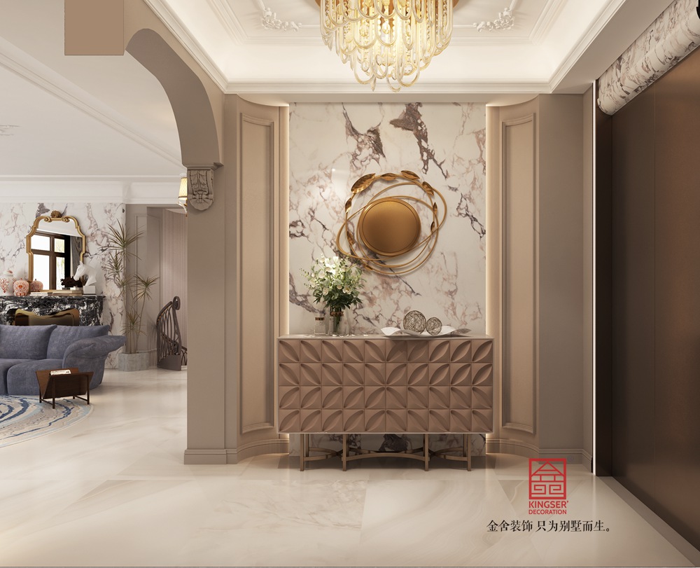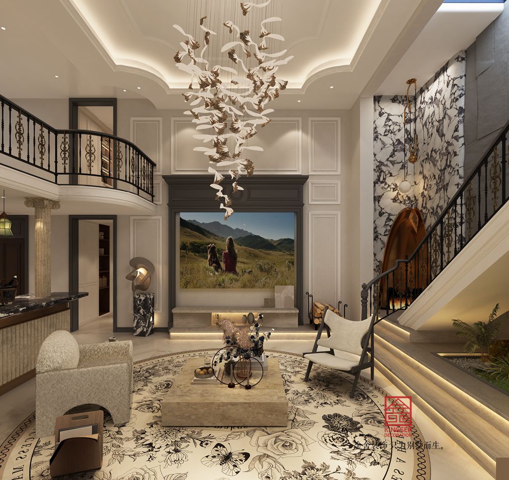 本案挑空客廳以新古典風格為基底,融合現代設計語言。運用經典的石膏線、護墻板勾勒空間秩序,搭配簡約造型的家具與藝術吊燈,既保留古典的優雅韻味,又注入當代的時尚與靈動,實現傳統與現代的對話。