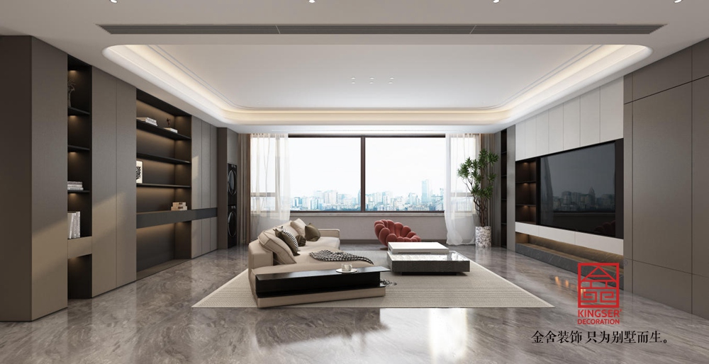 空間布局上,采用開放式設計,讓客廳與周邊區域自然銜接,增強了空間的通透感與互動性。大面積的落地窗是設計亮點,引入充足自然光線,同時將城市景觀納入室內,使空間與外界環境有機融合。