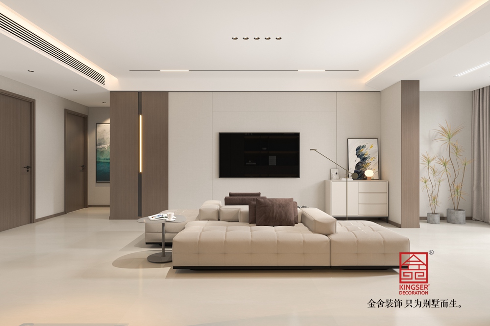 燈光設計上,結合了線性燈帶與點式射燈,既滿足了基礎照明需求,又通過光影變化增添了空間的層次感與藝術感。角落的綠植與裝飾畫,為空間注入自然生機與藝術氣息,整體布局開闊通透,每一處細節都彰顯出對品質生活與美學體驗的追求,打造出一個兼具實用性與美觀性的現代家居客廳。