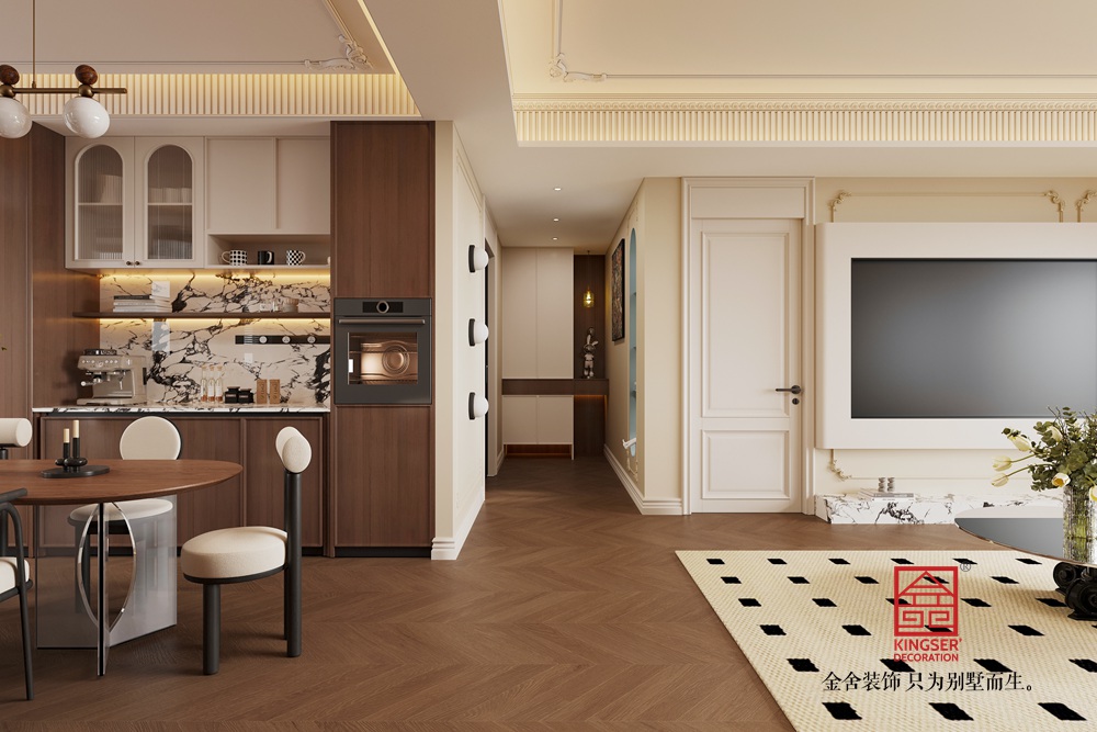 帶有復(fù)古雕花的黑色茶幾,精致細節(jié)凸顯中古韻味,其上擺放的花藝與書籍,增添了生活氣息。黑白幾何圖案的地毯,既劃分出休閑區(qū)域,又以經(jīng)典的復(fù)古元素,強化了整體風(fēng)格調(diào)性。