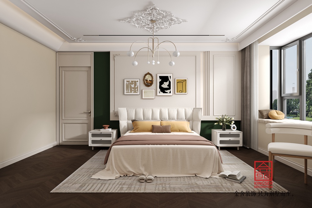該客廳以中古風(fēng)為設(shè)計脈絡(luò),巧妙融合復(fù)古與現(xiàn)代元素。整體色調(diào)溫暖柔和,木質(zhì)地板與淺米色墻面相襯,營造出靜謐舒適的基底氛圍。 墨綠色絲絨沙發(fā),憑借其復(fù)古的紋理與飽滿的造型,成為空間視覺重心,搭配色彩協(xié)調(diào)的抱枕,盡顯復(fù)古優(yōu)雅。兩側(cè)造型圓潤、質(zhì)感柔軟的白色單人椅,為空間注入靈動與溫馨感,與沙發(fā)形成有趣的風(fēng)格對話。