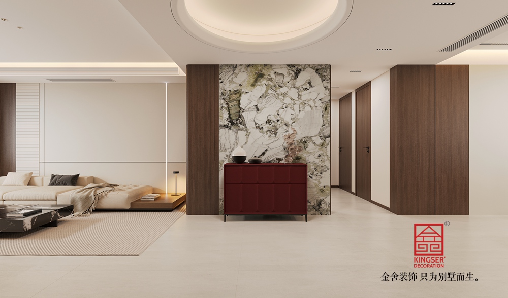 采用開放式布局,將觀影、休憩功能有機整合。線性燈光設計強化了空間縱深感,隱藏式燈帶與點光源結合,營造出柔和且富有層次的照明效果;大面積落地窗搭配百葉簾,保證采光的同時兼顧隱私,讓空間在通透與雅致間找到平衡。